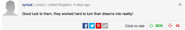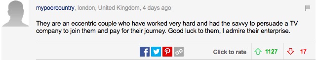 “他们是一对超乎寻常的夫妇,工作非常努力,很聪明地说服了一家电视台记录他们的翻修过程,并为他们支付行程的费用。祝他们好运,我佩服他们的进取心。”