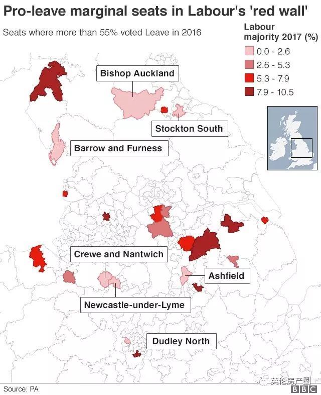这些“红墙”选区曾是工党的天下,主要集中在威尔士东北部、英格兰中部和北部。