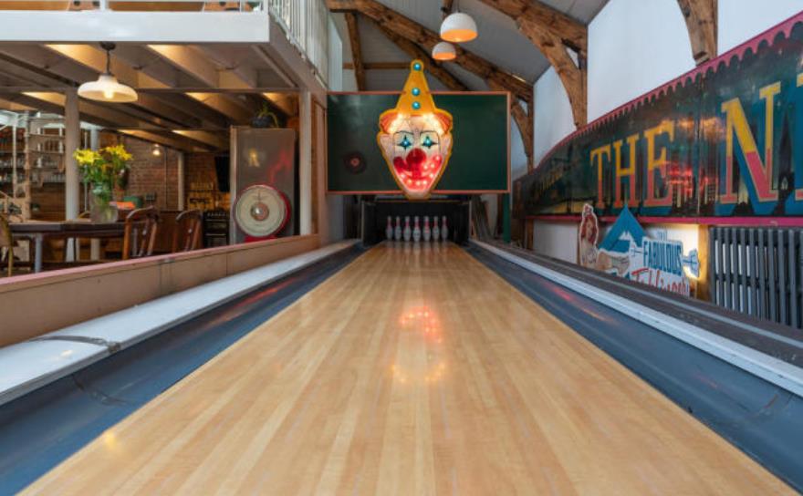 更让人惊讶的是,餐厨区的旁边还有一个货真价实的保龄球道,墙上挂着小丑的标志,似乎在观看比赛,不知道主人吃累了是不是会来玩两把。