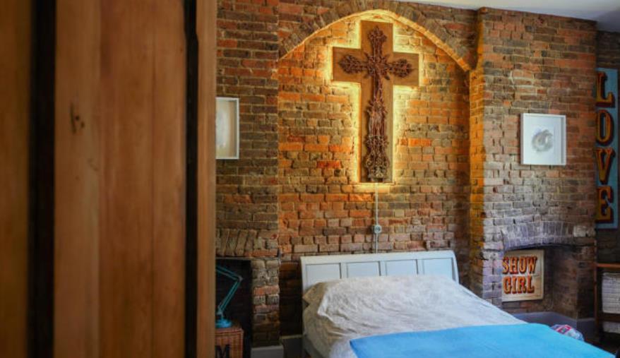 房屋共有四间风格迥异的卧室,主卧在一楼,最引入注目的就是墙面上发光的十字架,隐约有点“魔法学院”的味道~