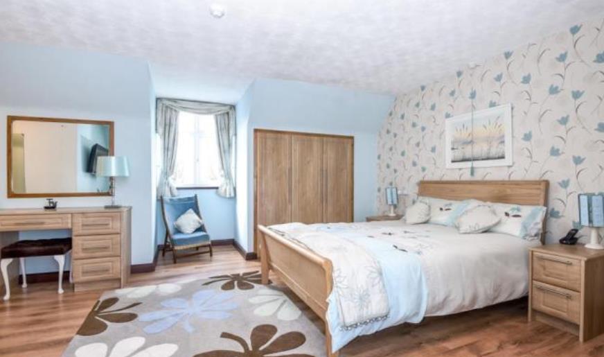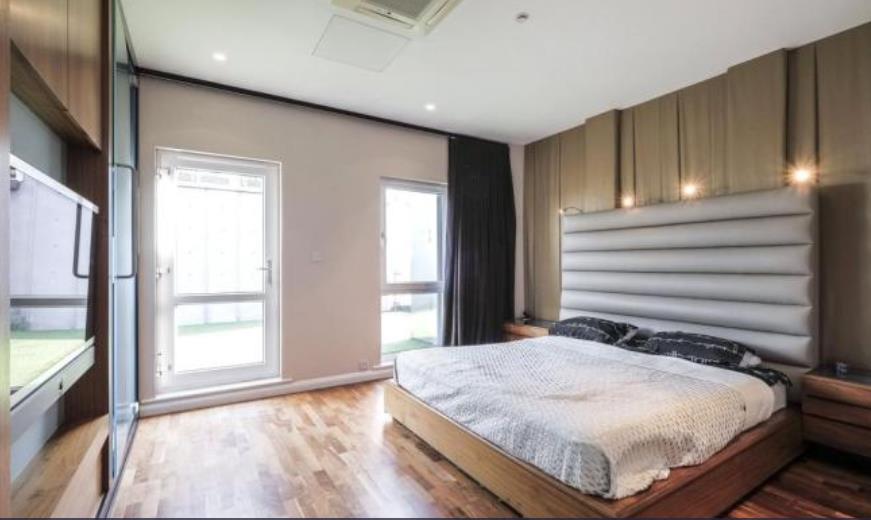 在楼上,除了两间主卧室套房,还有七间次卧。主卧的设计美观大气,透过窗户可以一览花园的景色