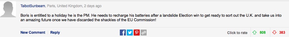 “鲍里斯有权休假,因为他是首相。在赢得大选之后,他需要给自己充电,准备好解决英国的问题。一旦我们摆脱了欧盟的舒服,他将带领我们走向美好未来!”