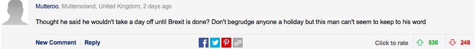 “记得他说过在完成脱欧之前不会休假?并不嫉妒任何人的休假,但鲍里斯似乎并不遵守诺言。”