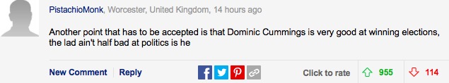 发布的这个广告,不但因为Cummings自己的身份。在去年Boris的党内竞选,随后的脱欧,以及12月的大选中,Cummings都为Boris助了不少力。 他提出的策略,宣传,竞选口号,都无比奏效。 在特蕾莎梅辞职后,帮助Boris击败党内其他候选人,成为了保守党领袖,英国新首相。 又在随后跟欧盟的谈判中,成功的去掉了兜底协议(backstop)相关的条款。还在双12的大选中,以get brexit done这样简单直白的竞选词,让Boris的保守党取得了几十年来的大胜利。