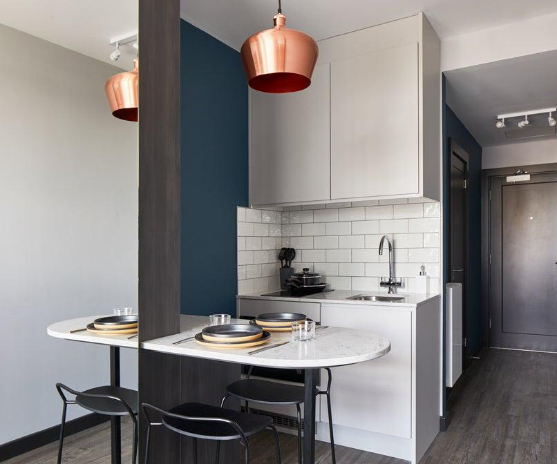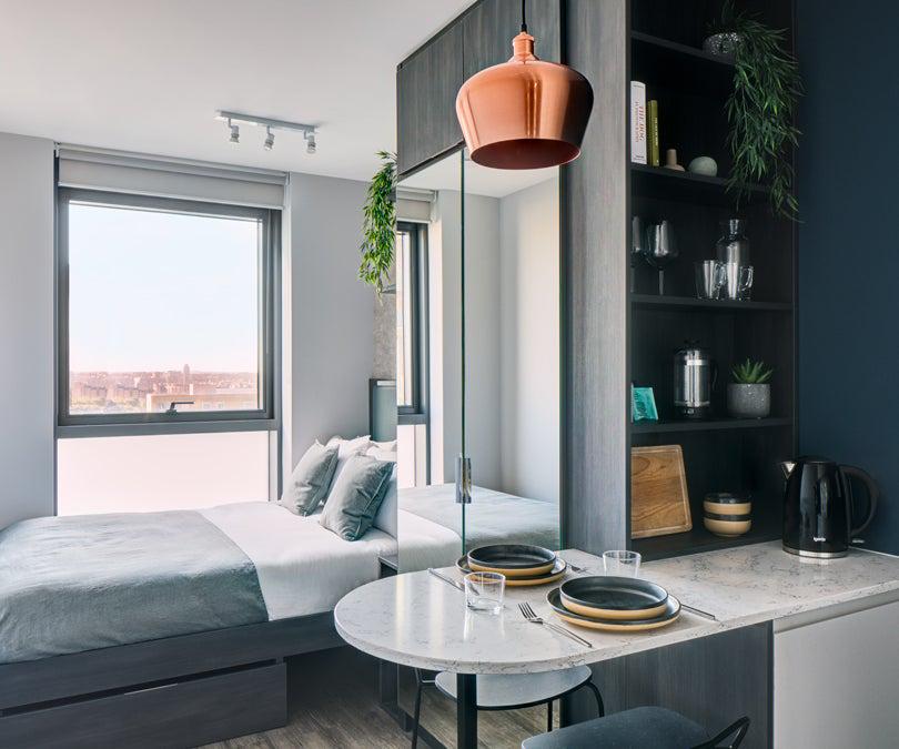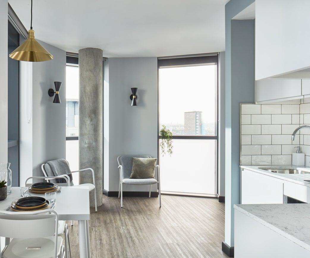 公寓共有4种户型,分别是Cosy、Standard、Comfy以及Big。其中,Standard户型的公寓一年期的月租金为1,517英镑,带有厨房区域和独立的卫生间。
