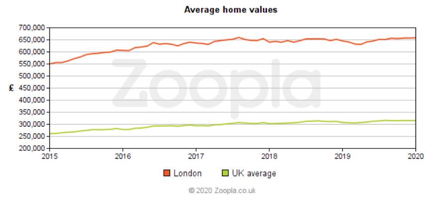 根据Zoopla的数据显示,截至2019年12月,伦敦的平均房屋要价为657,154英镑,是英国平均房价的3倍左右。