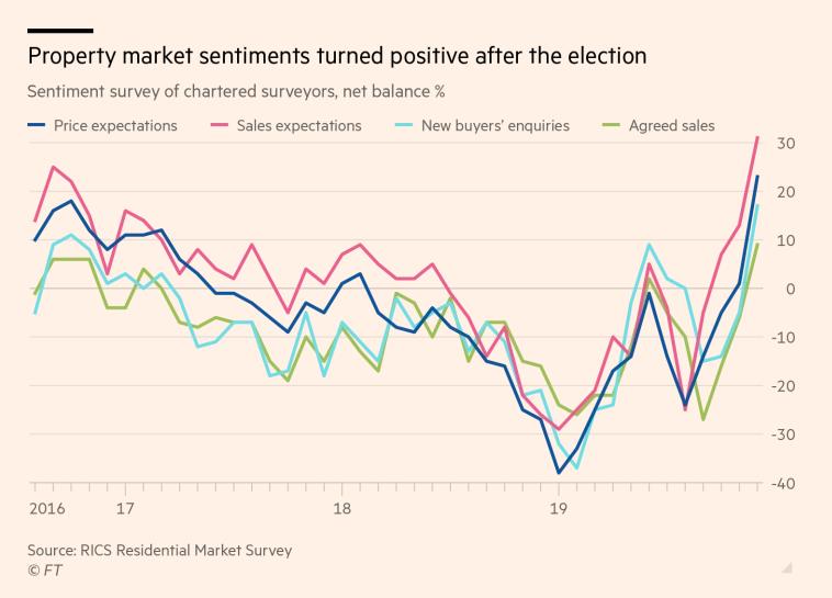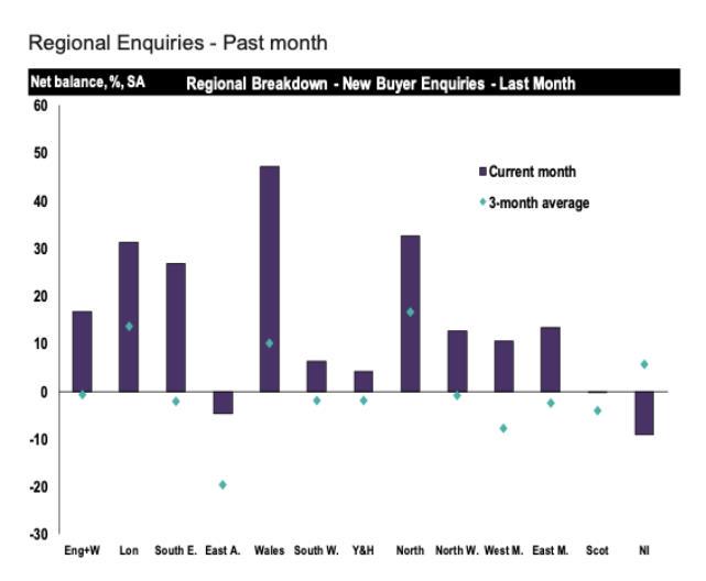 根据英国皇家特许测量师学会(RICS)近期公布的月度调查报告显示,过去一个月内,英国房地产市场中买家询盘人数同比上涨17%,房屋销售量同比上涨近10%。房屋销售量预期上涨超过30%,房屋平均价格预期上涨超过20%,均达到了3年来的最高水平。