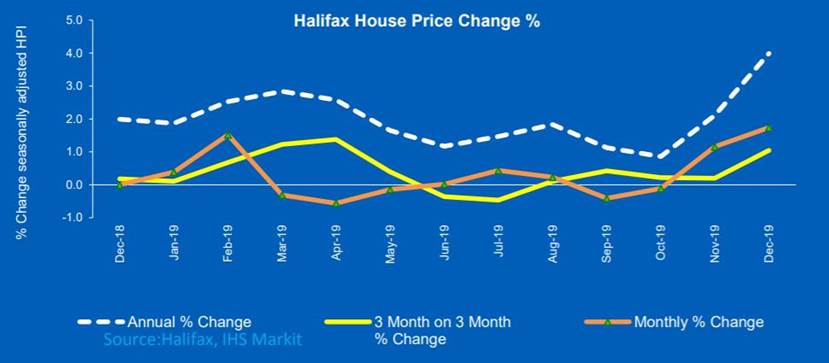 根据Halifax的最新数据,2019年12月,英国房价同比上涨了1.7%,这也使得去年一年的房价涨幅被推高至4%。