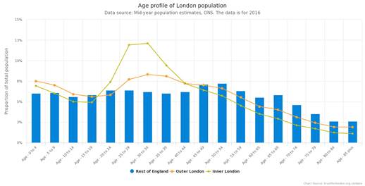 如下图所示: 伦敦各年龄段人口比例,黄色曲线–伦敦市中心,橘色曲线–伦敦郊区 蓝色柱状图–英格兰其他地区