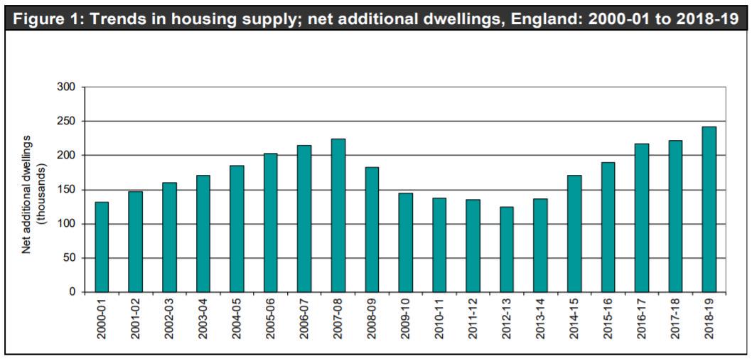 但从供给端来看,英国房屋供应却严重不足。2018-19年度英国净新增住宅24.1万套,远低于政府定下的30万套住房目标。