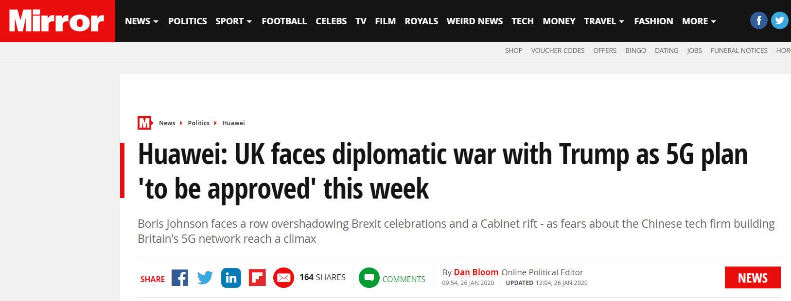 然而,随着英国脱欧逐渐尘埃落定,英国政府也不得不在这一事情上做出最终表态,而美国也不惜采取更多的措施来对英国进行强势施压,以在最后关头说服英国放弃使用华为5G。