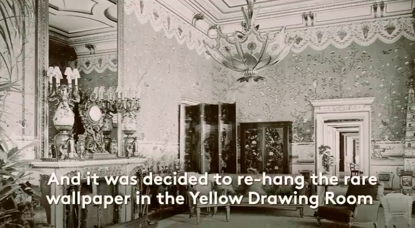 一战之后,玛丽皇后在储藏室里发现这块壁纸,随后命人将壁纸贴在白金汉宫的会客厅。