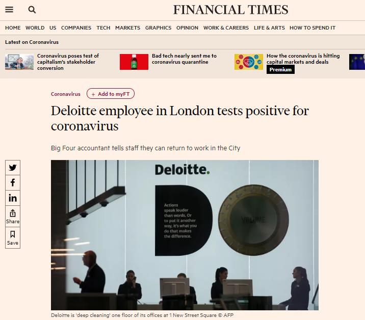 据悉,该公司有约2万名员工,德勤已经开始对位于伦敦金融城新街广场(Holborn)的一层办公场所进行“深度清洁”。