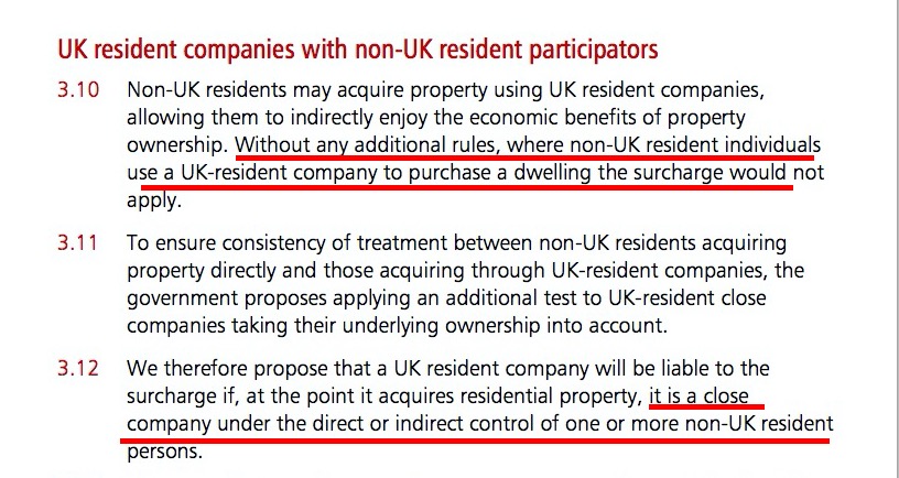 如果公司属于或者由一个或多个海外人士(也就是上面定义的,前12个月在英国时间少于183天的人)直接或者间接控制,则这种公司需要承担针对海外买家的额外税务。