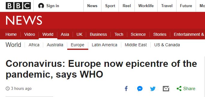 昨日,世界卫生组织(WHO)表示,欧洲现在已经发展成为全球新冠肺炎的“疫情中心”。