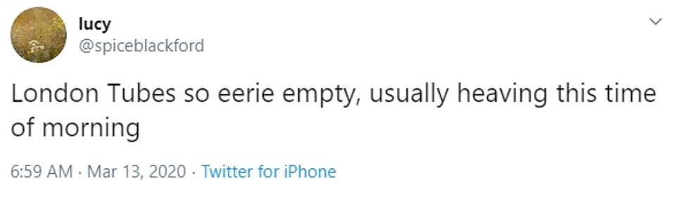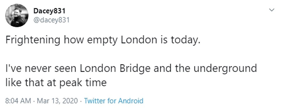 “震惊的发现伦敦今天是这么空旷。我从来没见过伦敦桥和地铁在高峰期有这种情景!”