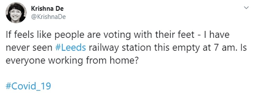 “感觉人们已经离开了这里,我从来没见过利兹火车站在早上7点是这么空荡荡,难道大家都在家工作吗?”