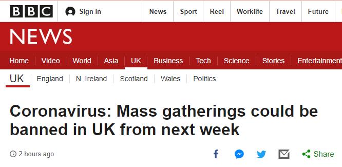 据BBC报道,有鉴于新冠肺炎疫情的爆发,英国有可能于下周颁布禁止大规模集会的紧急立法。