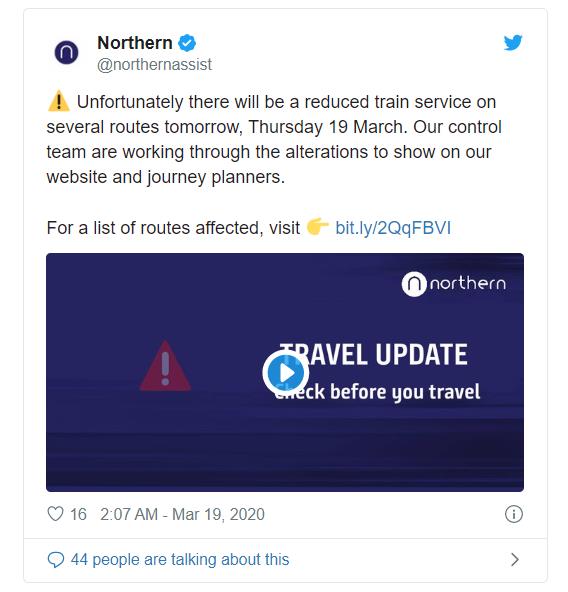 北方铁路公司(Northern Rail)表示,该公司在大曼彻斯特、默西塞德郡、兰开夏郡、约克郡、坎布里亚郡和泰恩郡等地区的部分火车班次可能会被取消,并提醒乘客及时登陆官网查看最新信息。