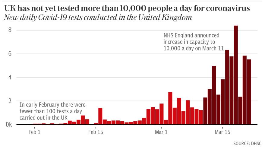 如上图所示,到目前为止,英国还没有哪一天的病毒检测数超过了一万,英国卫生服务部门目前每天只检测大约5,000名患者,主要针对入院患者,绝大多数有症状并在家隔离的人都没有得到检测。