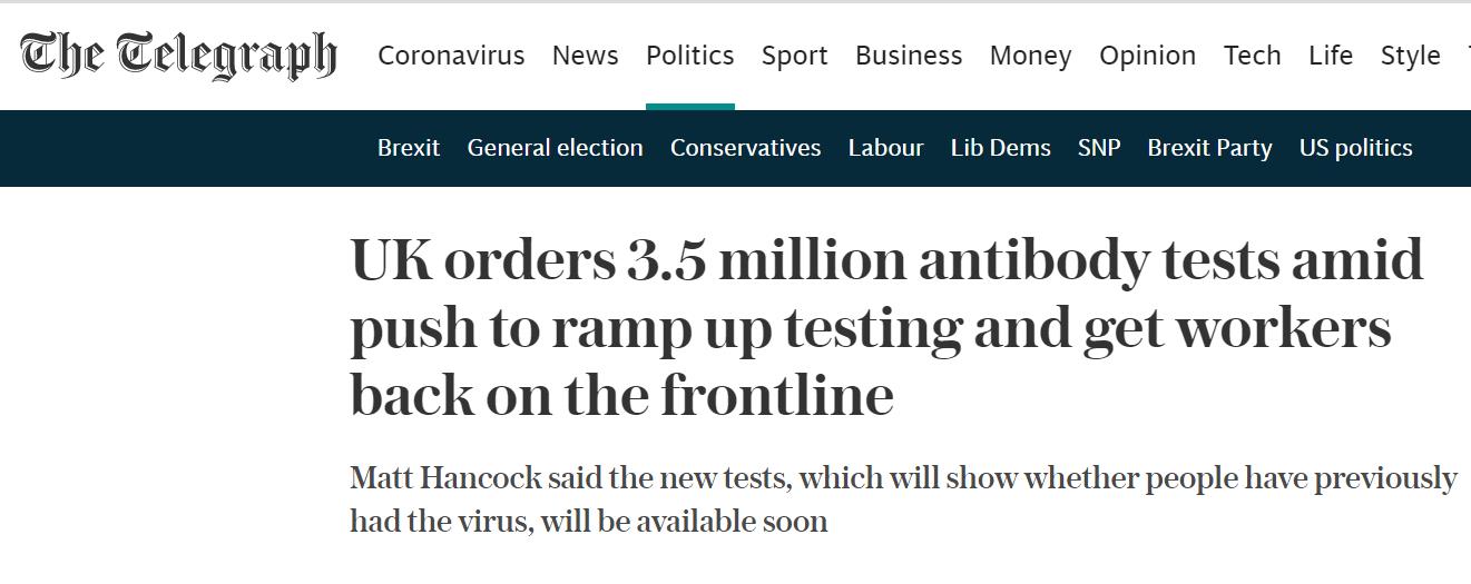 据媒体报道,英国政府已经订购了350万份抗体检测工具,以加快对民众是否已经产生新冠病毒抗体的测试速度。