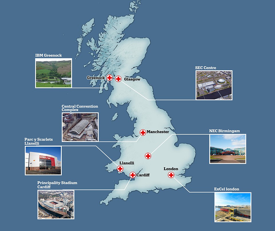 这些医院的选址已经曝光(如下图),分别是伦敦Excel国际会展中心,伯明翰国家展览中心(NEC),卡迪夫千禧球场,曼彻斯特中央会展中心,威尔士拉内利Parc y Scarlets体育场,格拉斯哥苏格兰会展会议中心(SEC Centre),以及格里诺克IBM中心。