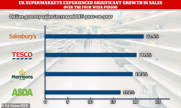 在截至3月22日的四周里,英国人在超市里总共花费了108亿英镑,营业额比圣诞节期间还要高。