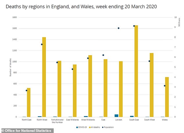 如下图所示,截至3月20日的一周内,英格兰和威尔士各地区的死亡人数