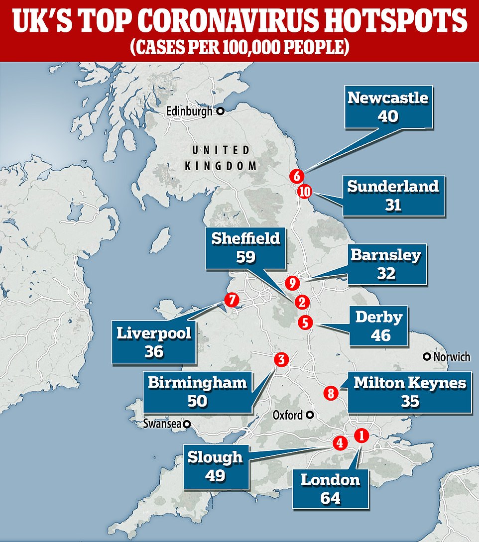 其中,以下几个城市成为了疫情的重灾区,每十万人中的感染人数如下图所示: