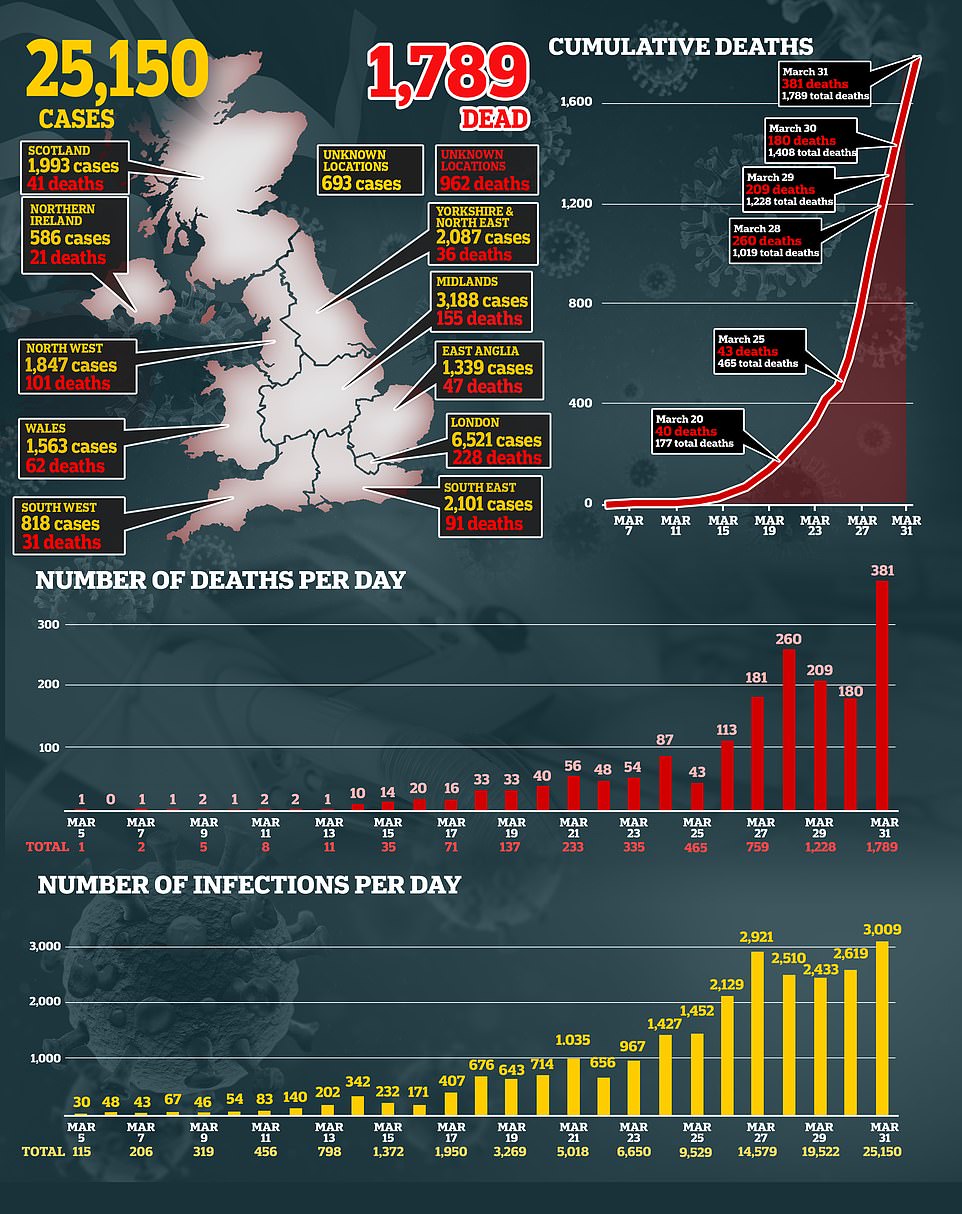 截至2020年3月31日上午9点,英国确诊人数达到25,150人。