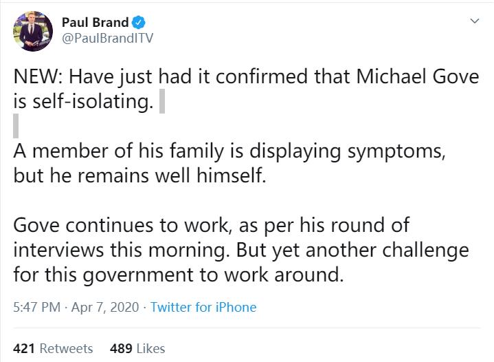 据英国独立电视台的保罗·布兰德(Paul Brand)称,迈克尔·戈夫已经开始进行自我隔离了。