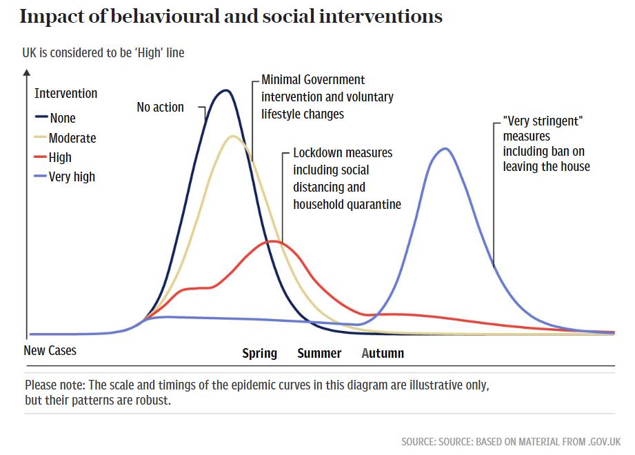 不难看出,红色曲线是这套模型中的“最优解”,也是英国政府目前正在采取的措施。