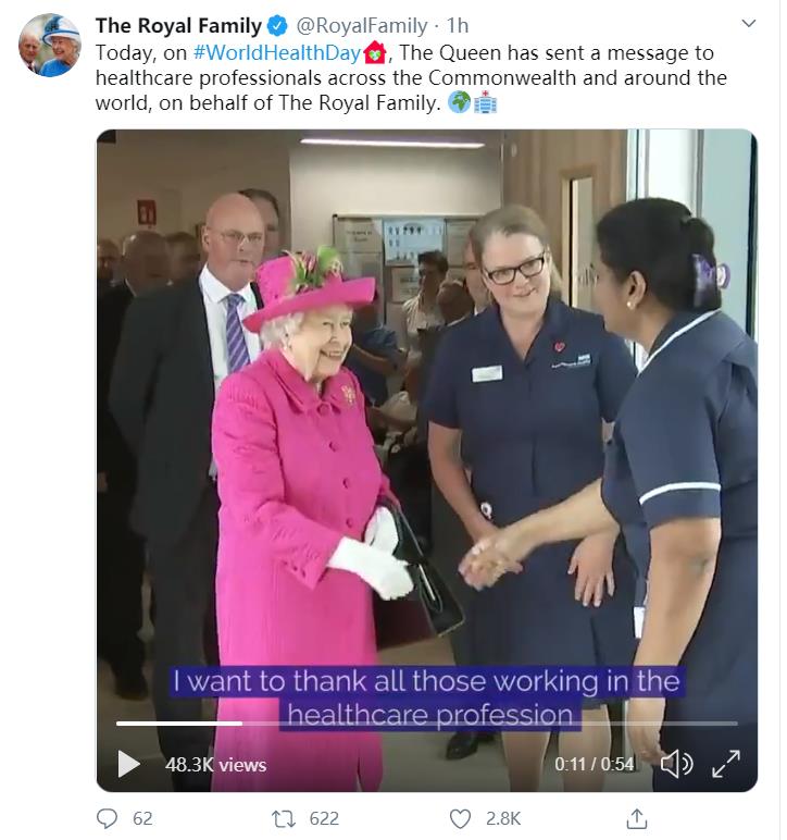 推文称:“女王代表王室,感谢英联邦和世界各地所有在疫情期间‘无私奉献’的医护人员们。”,并配上了一段皇室慰问医护人员的视频。