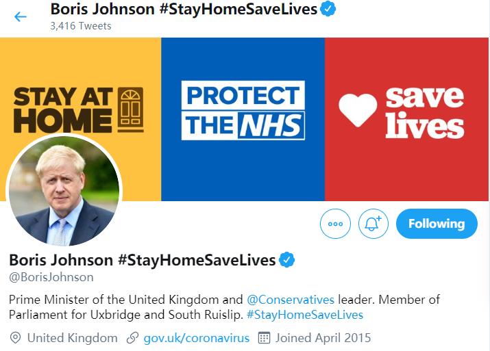 但是一到周末,仍有部分民众“冥顽不灵”,选择去公园“赏春”。作为首相的鲍里斯为了做表率,直接把Twitter名改为了“Boris Johnson #StayHomeSaveLives”,以此来号召大家减少出门的频率。