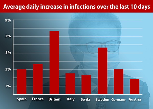 其余几个欧洲国家的日均增长率从高到低分别是:瑞典5.7%,法国3.7%,西班牙3.2%,德国3.0%,意大利2.5%,瑞士2.2%。