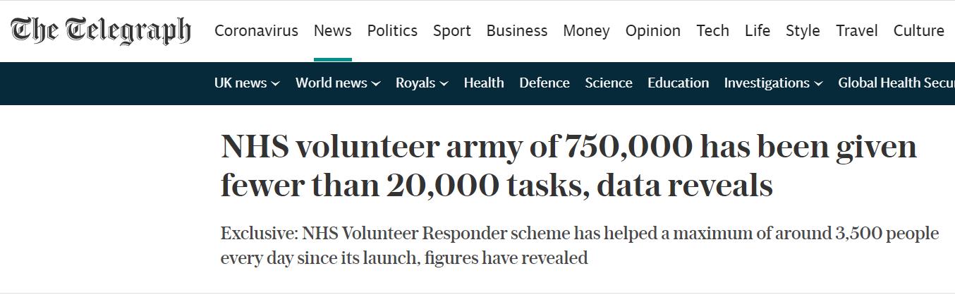 据英国媒体爆料,NHS招募来75万名志愿者,本打算用来帮助弱势群体度过新冠危机,但迄今为止,在全国范围内这些志愿者们只承担了不到2万项任务。