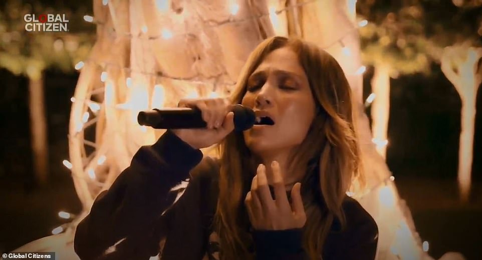 Jennifer Lopez坐在梦幻的室外为大家带来演唱。