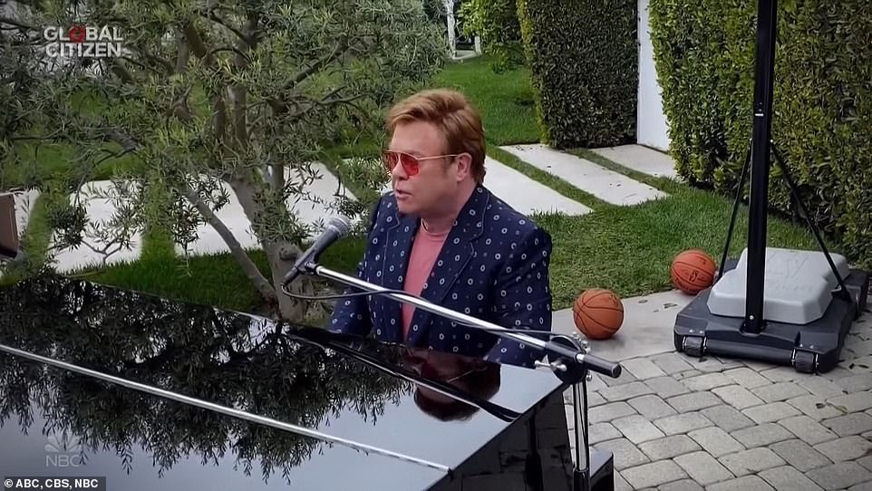 今年73岁的Elton John在户外边弹边唱歌曲 I’m Still Standing。