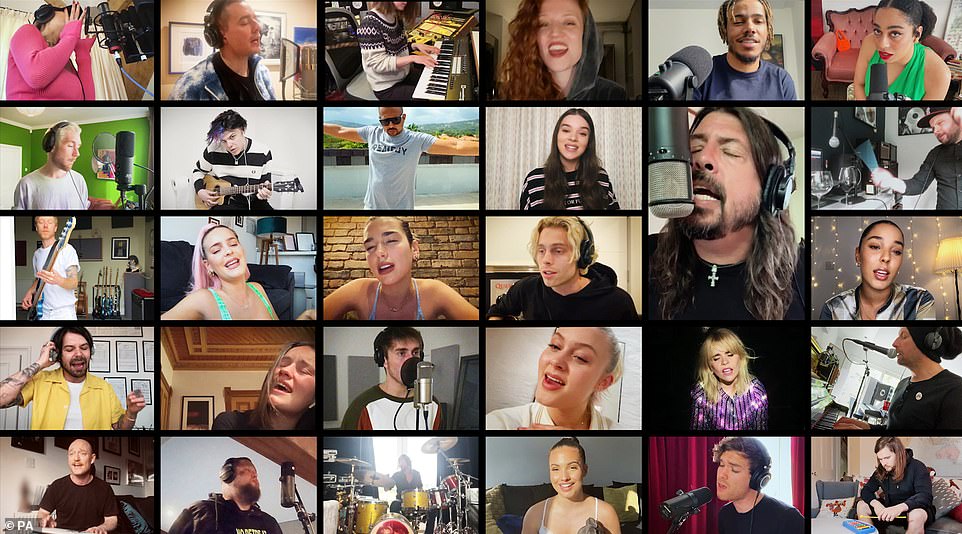 节目一开始,包括Dua Lipa、Rita Ora,Chris Martin在内的30位歌手,共同演绎了Foo Fighters乐队的经典曲目《Times Like These》,这首发行于2002年的歌曲也成为了当晚的慈善单曲。