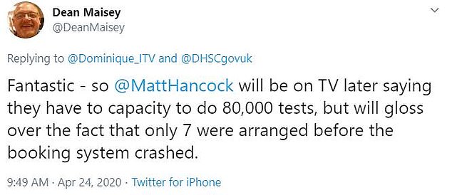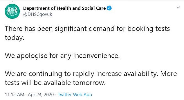 “今天对预约检测的需求很大,我们对于给您带来的不便深表歉意。政府正在继续迅速提升系统的可用性,明天将会有更多的检测。”