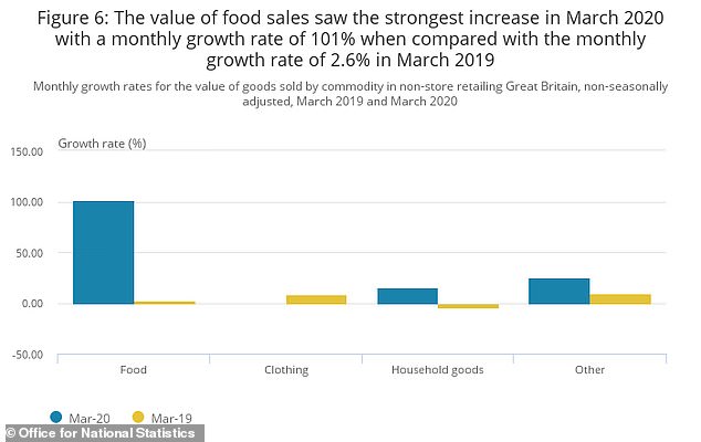 3月份的网上食品销售总额较去年同期更是增长了近一倍,增幅高达101%。