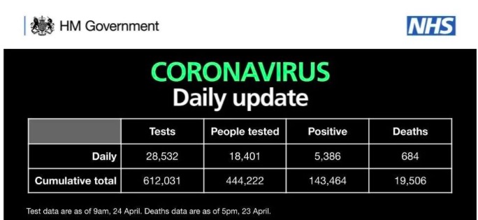 截至今天,英国新做了28,532次检测,共检测了18,401人,其中5,386人确诊,新增死亡人数684人。