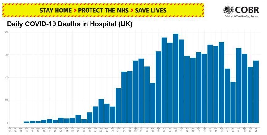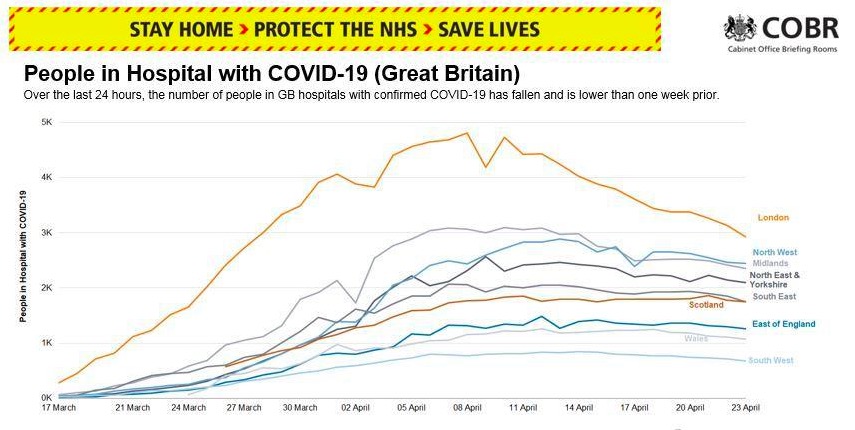 图3 住院人数上,可以看到,伦敦的数字下降很离开了。 另外值得一提的是,伦敦的入院病人的确诊人数。 在过去24小时里这个人数增加不到1000人。 这是在过去几周来,第一次每日人数小于1000。 所以我们应该继续保持隔离,不能让这个曲线开始上升。