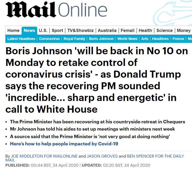 美国总统特朗普今天也侧面证实了这一消息,称鲍里斯已经恢复到原来的样子,并做好离开乡间别墅的准备了。