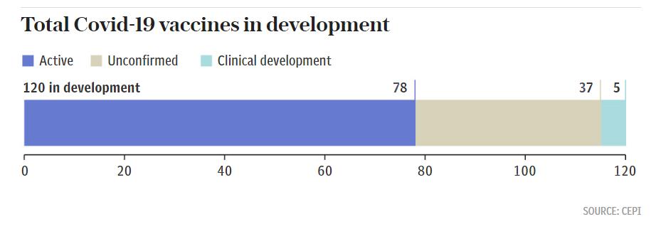 根据流行病预防创新联盟(CEPI)的不完全统计,目前全球总共有120多个机构展开了疫苗的开发,其中,有5个团队已经展开了临床试验。