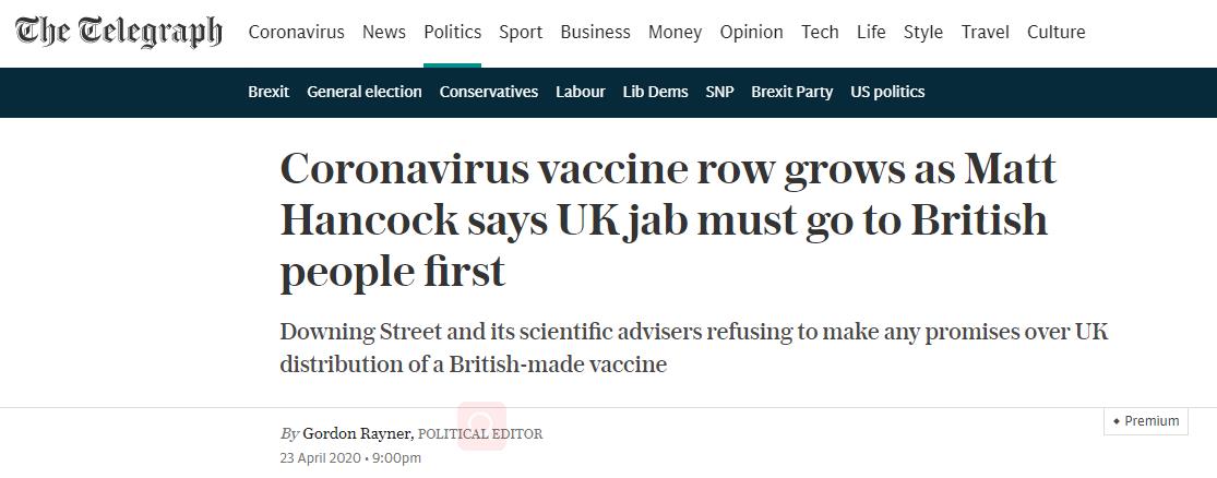 英国公共卫生部门的一位消息人士也承认了这件事,并表示:“马特·汉考克是英国卫生部长,他的工作是保护英国的民众和卫生服务。如果英国是第一个开发出疫苗的国家,他肯定希望为疫苗买单的英国人能够拥有优先权。”