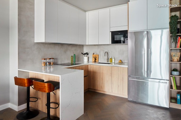 原本的厨房给人的感觉比较挤,奥马尔表示:“原来厨房的每一侧都有两个螺柱壁,厨房在一个小立方体中,感觉与房间的其余部分断开了联系。于是,我拆除了螺柱壁,打造了一个完全开放式的空间,并将更多的光线带入烹饪区域。厨房布局从U形更改为L形。小型的就餐区可以分割厨房和客厅。”