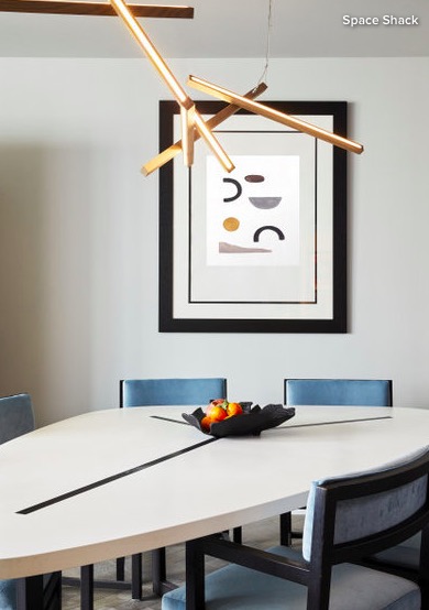 至于餐桌,家中原本就有一个这样不规则形状的白色餐桌,奥马尔增添了蓝色天鹅绒座椅,还在餐桌上增添了造型独特的吊灯,充满了设计感。
