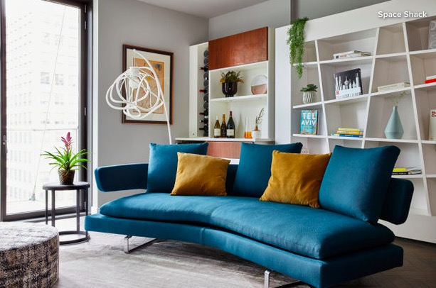 奥马尔选择了一个有弧线的沙发,与这对房主的直边书架形成鲜明对比,为整个空间增添了些许柔和:“客户已经拥有了很多公寓中摆放的艺术品,我们加以利用并用色彩来激发设计灵感。”