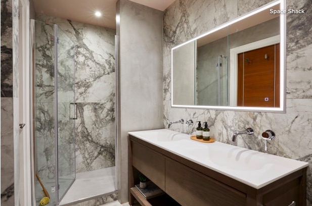 此外,主卧还配有一个卫生间,也采用了大理石,从镜子中我们也可以看出,依然有一些墙面是水泥墙面,与另一个卫生间的风格保持了一致。